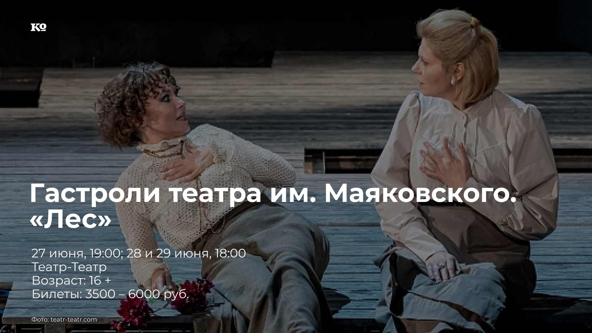 Начинаются гастроли Московского академического театра им. В. Маяковского на сцене Театра-Театра. «Лес» — постановка художественного руководителя театра Егора Перегудова по пьесе А.Н. Островского. На перекрёстке лесных дорог, посреди России, сходятся два провинциальных артиста, комик Счастливцев и трагик Несчастливцев. Дорога доводит их до «Пеньков» — усадьбы богатой помещицы Гурмыжской, где творится «тёмный лес»: молодые женятся на старых ради денег, бесприданницы топятся от любви, все врут и никто не счастлив. Поработав в других спектаклях со стихиями ветра, воды и огня, в пьесе Островского художественный руководитель «Маяковки» Егор Перегудов исследует новую стихию. Леса давно нет. Нет ни пеньков, ни опилок. Одна природная сила вытеснила другую, оставив человека в тревожной зыбкости и полном бессилии. Мир буквально поплыл из-под ног, и людям здесь больше не на что опереться.