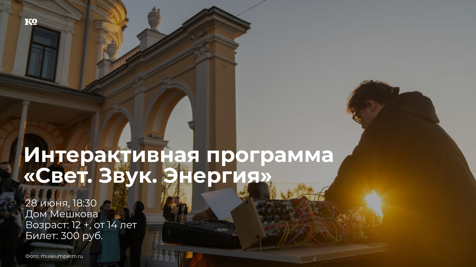 В программе — авторские мастер-классы «Лепестки» и «Стёклышки» ювелира Василисы Балюк по созданию летних украшений и декоративных мини-панно из старых тканей и стекла в технике апсайклинг. Исследование экспозиции музея с помощью света в формате экскурсии «Практики наблюдения» вместе с художником Петром Стабровским. Центральным событием вечера станет звуковой перформанс от пермских аудиохудожников Александра Кошелева и Ильи Гришаева, представляющий импровизацию в жанрах ambient и noise.