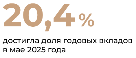 Примечательно, что в мае доля годовых вкладов достигла 20,4%, что стало рекордом текущего года. В то же время самыми востребованными остаются трёхмесячные депозиты: на них стабильно приходится от 28 до 32% общего объёма спроса, такие данные приводят в «Банки.ру». Это говорит о том, что часть клиентов по-прежнему предпочитают сохранять гибкость, ожидая изменений на финансовом рынке.