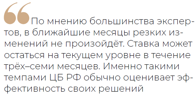 По мнению большинства экспертов, в ближайшие месяцы резких изменений не произойдёт. Ставка может остаться на текущем уровне в течение трёх—семи месяцев, считает Анна Байкова. Именно такими темпами ЦБ РФ обычно оценивает эффективность своих решений. В подтверждение она ссылается на слова главы регулятора Эльвиры Набиуллиной, подчёркивающей постепенность и осторожность в принятии решений.