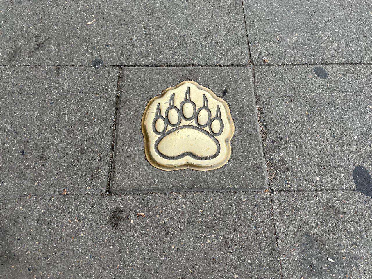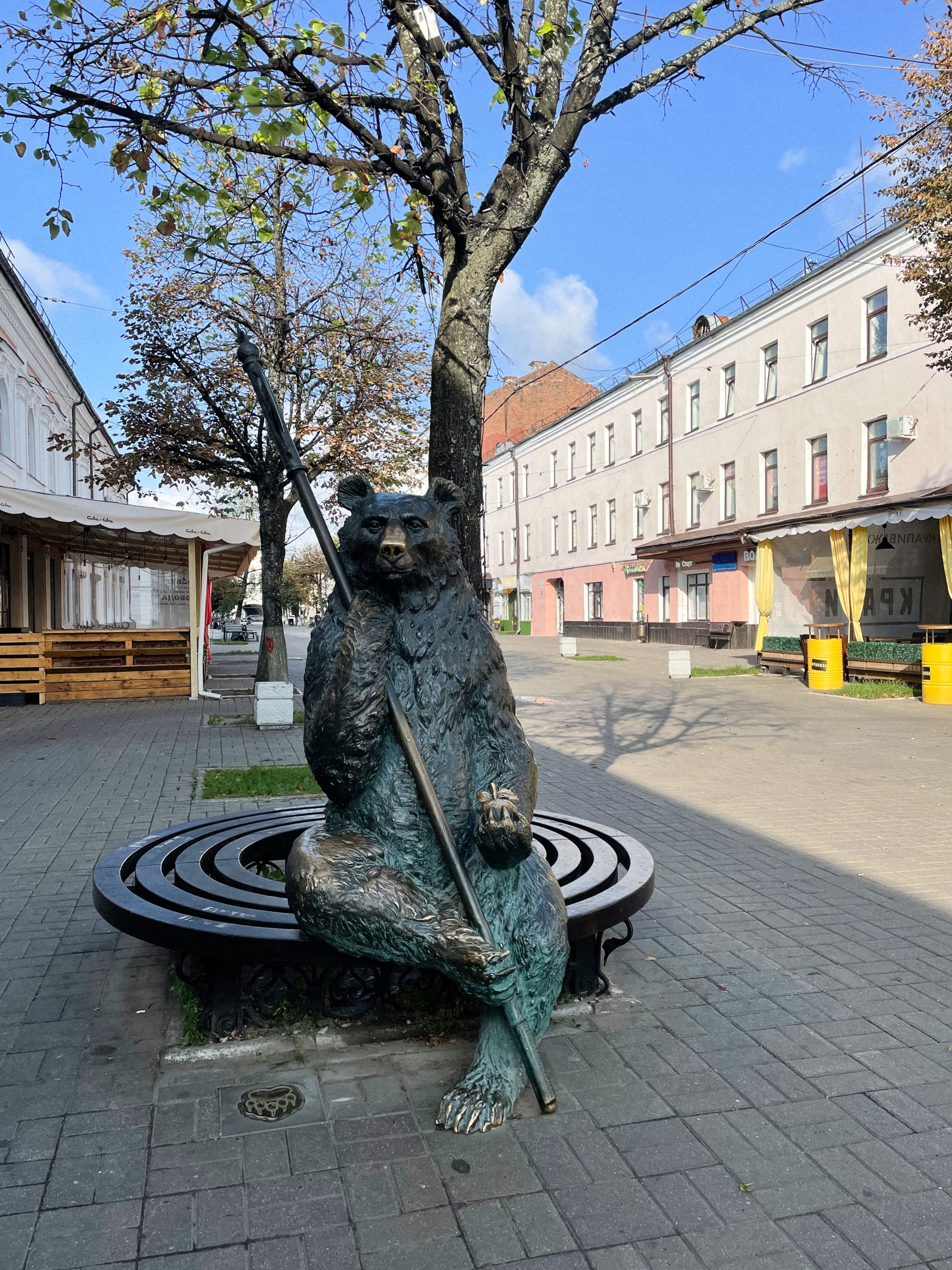 На одной из скамеек пешеходной улицы расположился бронзовый медведь с секирой (как не гербе) и яблоком. Туристические группы водят к композиции, обещая исполнение желаний, если потереть нос животному. Судя по сверкающей бронзе, многие верят... Всего же разных памятников медведю в Ярославле 12!
