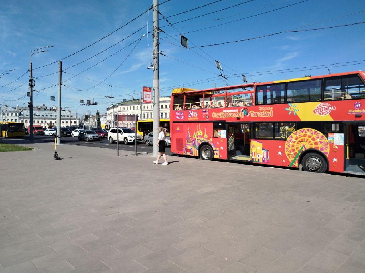 От Стрелки можно снова вернуться к Ярославскому музею-заповеднику, пройдя вдоль Которосли, и сесть на красный двухэтажный экскурсионный автобус с открытым верхом. Он объезжает всё «самое-самое» за полтора часа. Аудиоэкскурсия транслируется через наушники. Стоимость билета составляет 1500 руб. (детям дешевле). Заплатив один раз, можно выходить на каждой остановке, чтобы изучить локацию подробнее, и садиться на следующий экскурсионный автобус уже бесплатно. Интервал движения - 30 минут.