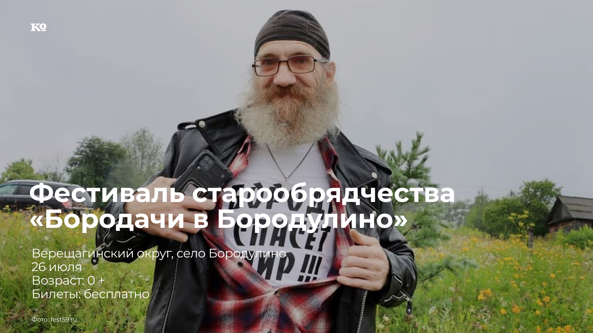 Название фестиваля определяет исторически сложившийся образ старообрядцев, ревнителей древнего благочестия, предков жителей поселка Бородулино, украшенных бородами. Фестиваль способствует сохранению традиций малой религиозной группы старообрядцев. В программе: конкурсы бородачей и девушек на выданье; Бородулинские чтения, на которых бородачи расскажут о сохранении духовных и культурных ценностей, конкурс на лучшую фотографию фестиваля, мастер-классы по народным промыслам, традиционные народные игры, гонка по пересечённой местности «Бородулинская тропа героев», посещение музея староверов Верхнекамья, экскурсия на святой источник, выступление самодеятельных коллективов. Будут работать полевая кухня и ярмарочные ряды.
