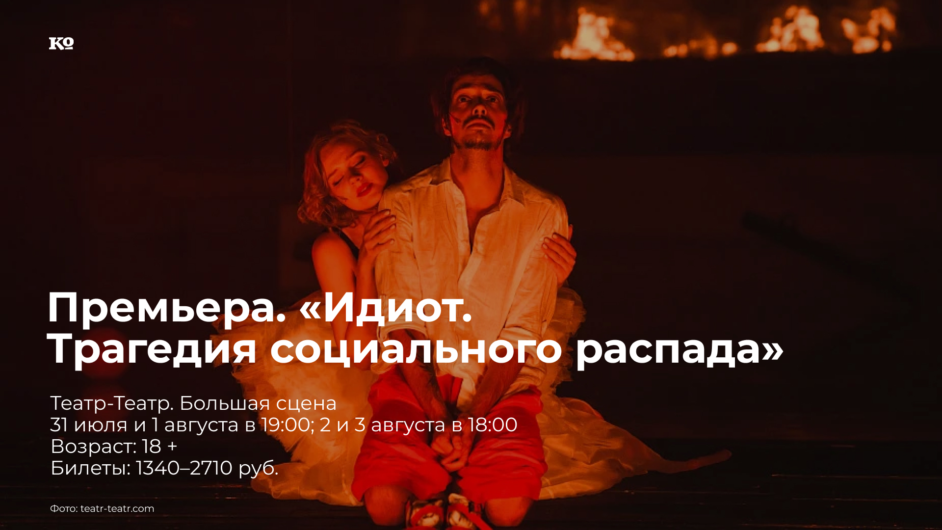 Последняя премьера на большой сцене Театра-Театра перед её закрытием на реконструкцию. Режиссёр, автор пьесы Марк Букин: «Наш спектакль о банальности зла, о моральном разложении, об обществе, которое больно изнутри и совершенно не торопится найти исцеление. Все герои истории находятся в пограничной ситуации собственной болезни, которая проявляется у каждого по-своему, и с уверенностью утверждать, кто же на самом деле из них Идиот, довольно трудно. Самое страшное, что мы все застряли в мире романов Достоевского… А где из этого выход, совершенно неясно; но искать его необходимо. Поэтому давайте отправимся в это опасное и увлекательное путешествие вместе и всё-таки попробуем найти спасительную дверь, за которой, возможно, прячется добро». Художник-постановщик спектакля Евгений Терехов, хореограф — Алексей Каракулов, композитор и видеохудожник — Андрей Платонов (но есть и много другой музыки). В главных ролях: Степан Сопко (князь Мышкин), Анастасия Демьянец (Настасья Филипповна), Марат Мударисов (Рогожин), Анна Огорельцева (Аглая).