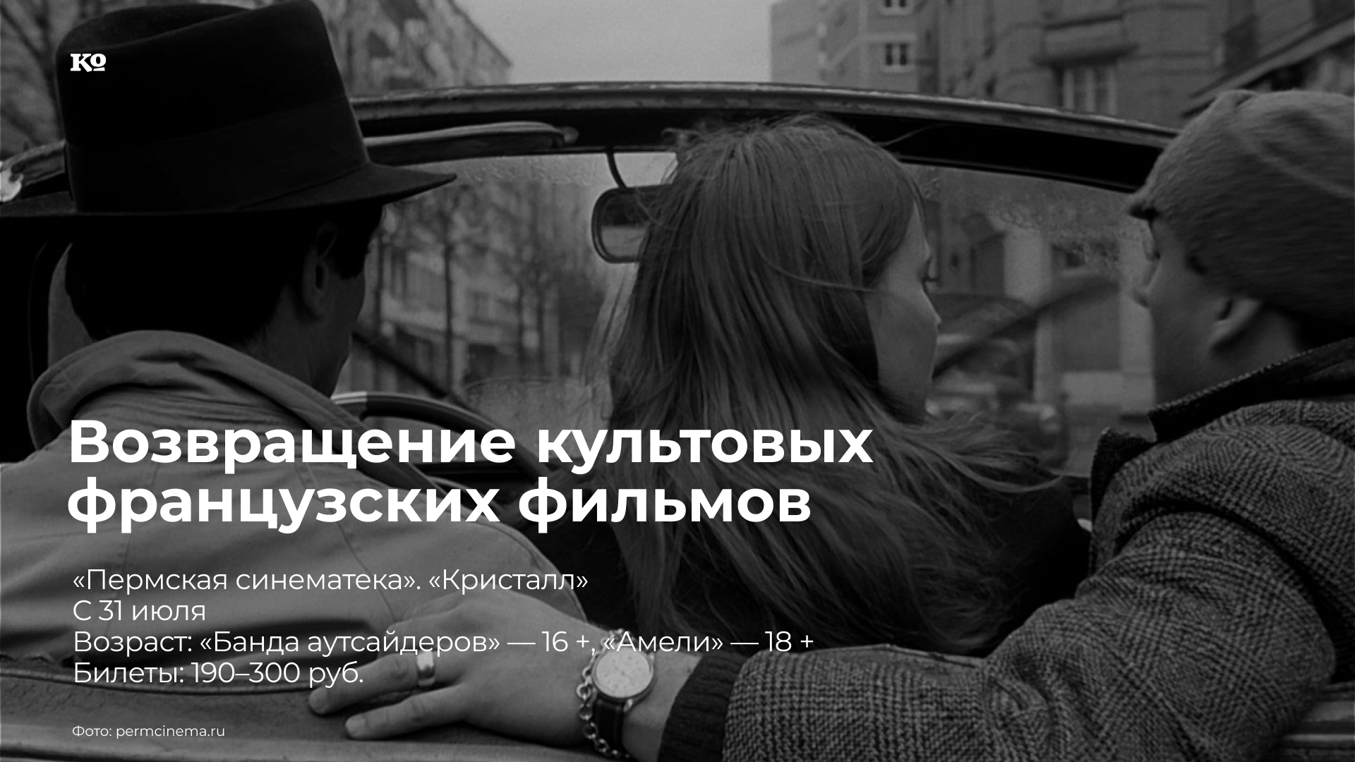 На пермские экраны возвращаются два шедевра французского кино. «Банда аутсайдеров» Жана-Люка Годара (1964) — это, по словам режиссёра, как если бы «Алиса в стране чудес» встретила Франца Кафку. Двое скучающих приятелей, Артур и Франц, одержимы голливудскими гангстерскими фильмами. Знакомство с Одиль приводит к плану совместного ограбления: в особняке её тети спрятана крупная сумма. История трёх героев становится поводом для дерзкой игры режиссёра в нуар с яркими сценами, среди которых знаменитый забег по Лувру и танец в кафе. «Амели» Жана-Пьера Жене (2001) — один из самых поэтичных фильмов в истории кинематографа. История застенчивой официантки с Монмартра заняла второе место в списке «100 лучших фильмов мирового кинематографа не на английском языке», составленном в 2010 году журналом Empire. Оба фильма идут на французском языке с русскими субтитрами, а также в дубляже — каждый сможет выбрать подходящий для себя формат перевода.