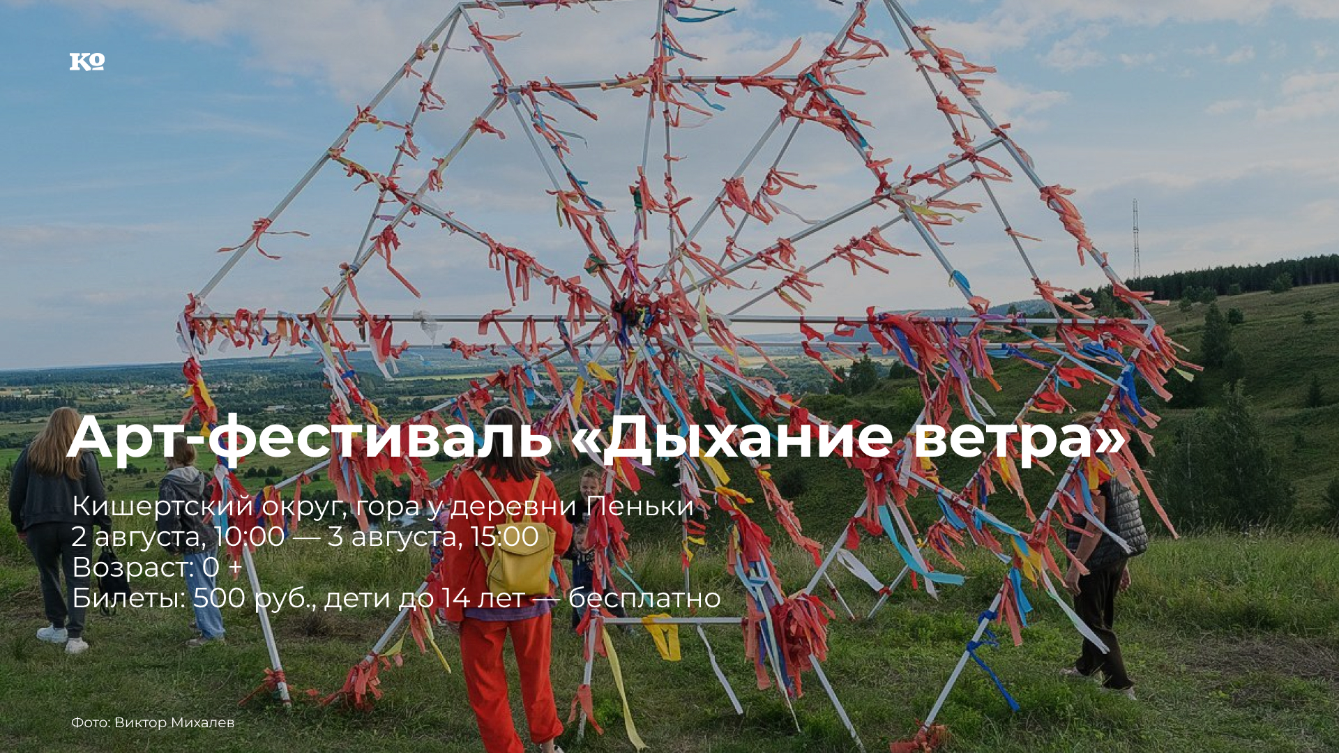 Фестиваль представит итоги работы детского арт-лагеря, организованного Андреем Вертипраховым, председателем Федерации воздухоплавателей Пермского края и организатором «Небесной ярмарки». В лагере дети создают арт-объекты, взаимодействующие с ветром. В программе: экскурсии, около 20 творческих мастер-классов — от создания открыток до художественной ковки, полёты воздушных шаров и паралётов, световой перформанс, знакомство с новыми арт-объектами, концерт группы «Тропы», диджей-сет с живой перкуссией Дмитрия Попова и многое другое. Площадку фестиваля уже украшают 15 масштабных арт-объектов, появившихся на фестивалях прошлых лет.