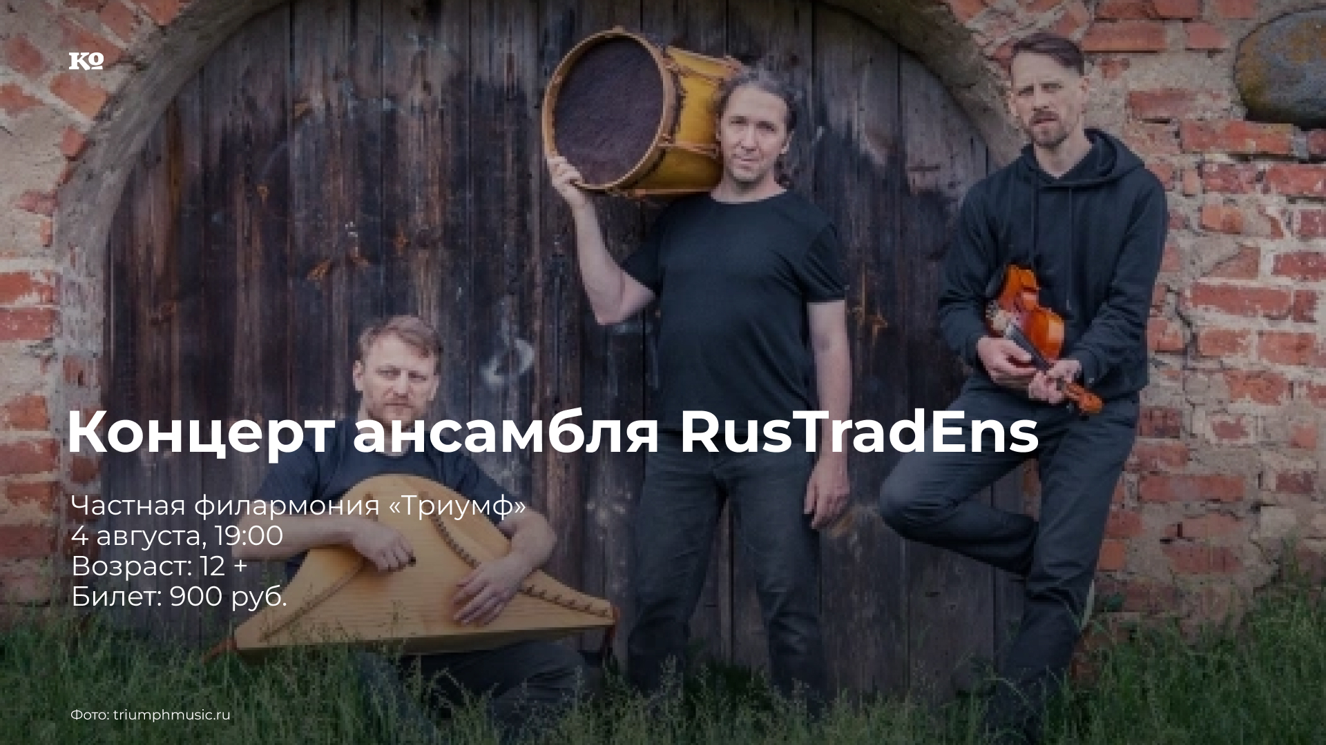 Ансамбль RusTradEns — это инструментальный и вокальный фольклор русских в его аутентичной форме. Полифонические наигрыши на крыловидных и шлемовидных гуслях, гармонях разных регионов России, скрипичное и вокальное многоголосие русских протяжных песен. В ансамбль входят музыканты из Перми, Москвы и Екатеринбурга, много лет изучающие фольклор и совершенствующиеся в мультиинструментальном исполнительстве. Игорь Серёдкин (скрипка, гармонь) — ведущий методист по музыкальному фольклору Центра традиционной народной культуры Среднего Урала (Екатеринбург). Дмитрий Парамонов (гусли) — исследователь с большим опытом в области аутентичной традиции, побывавший в фольклорно-этнографических экспедициях в разных частях России, основатель «Мастерской гусельного искусства» и «Музея русских гуслей и китайского гуциня» в Москве. Андрей Михайлов (перкуссия) занимается этнической перкуссией и ударными инструментами разных народов мира уже более 25 лет. Создатель и музыкант нескольких барабанных коллективов, основатель проекта «О.Р.З.А.» (Общество ритмических и звуковысотных архитекторов). В репертуаре коллектива — самые сложные образцы народной инструментальной и вокальной музыки, где вариативность и импровизационность возведены в канон.