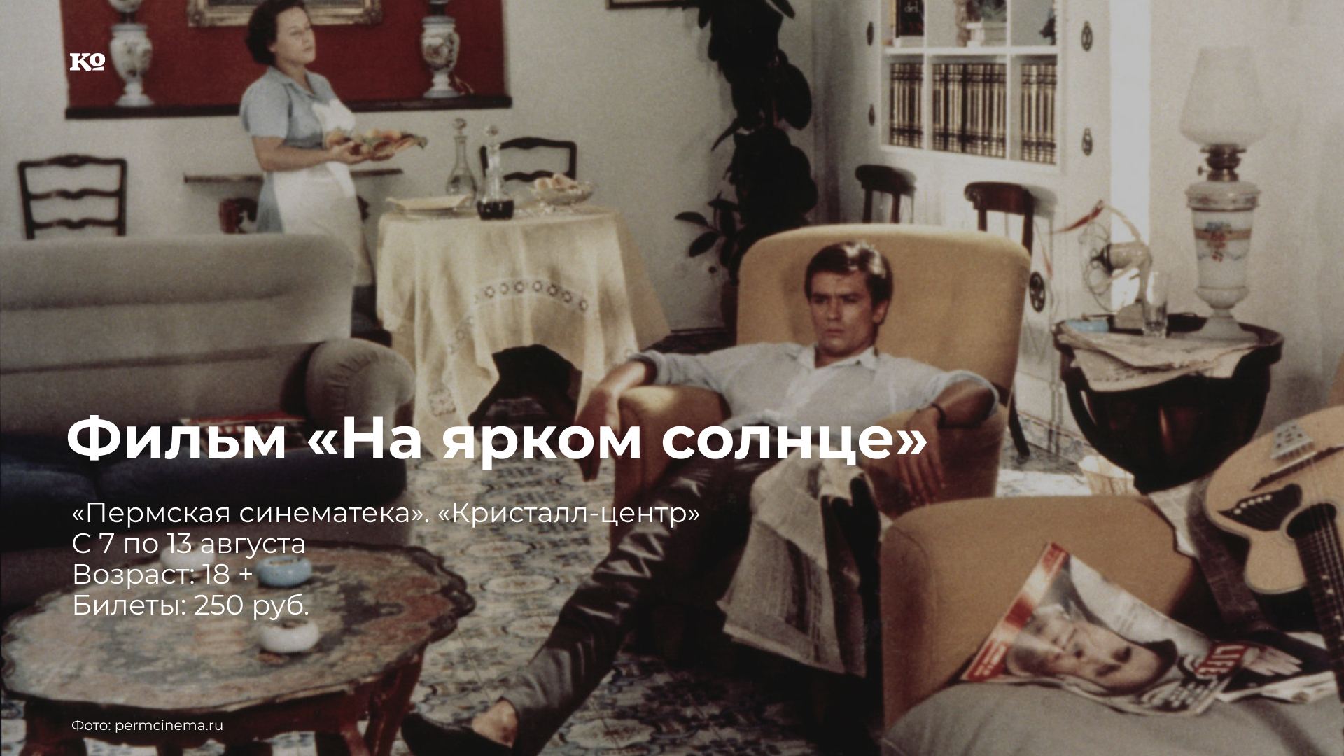 «Пермская синематека» продолжает возвращать в репертуар культовые французские фильмы. Вслед за «Бандой аутсайдеров» и «Амели» на экран выходит «На ярком солнце» Рене Клемана — лучшая, несмотря на успех недавней многосерийной версии, экранизация детектива Патриции Хайсмит «Талантливый мистер Рипли». Огромный счёт в банке, красивые женщины, яхта, ласковое море — это сладкая жизнь, которую Том Рипли так хочет иметь и которая у Филиппа Гринлифа уже есть. Филипп даже не подозревает, на что готов пойти Том, чтобы сделать его жизнь своей... Бедный авантюрист превращается в миллионера, но даже самая искусная подделка всегда остаётся лишь копией, даже если над ней трудился талантливый мистер Рипли. В главных ролях — невероятные и прекраснейшие Ален Делон и Мари Лафоре.