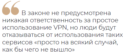 В законе не предусмотрена никакая ответственность за простое использование VPN, но люди будут отказываться от использования таких сервисов «просто на всякий случай, как бы чего не вышло, особенно после волны первых громких дел по принятому закону», полагает Аверкиев.