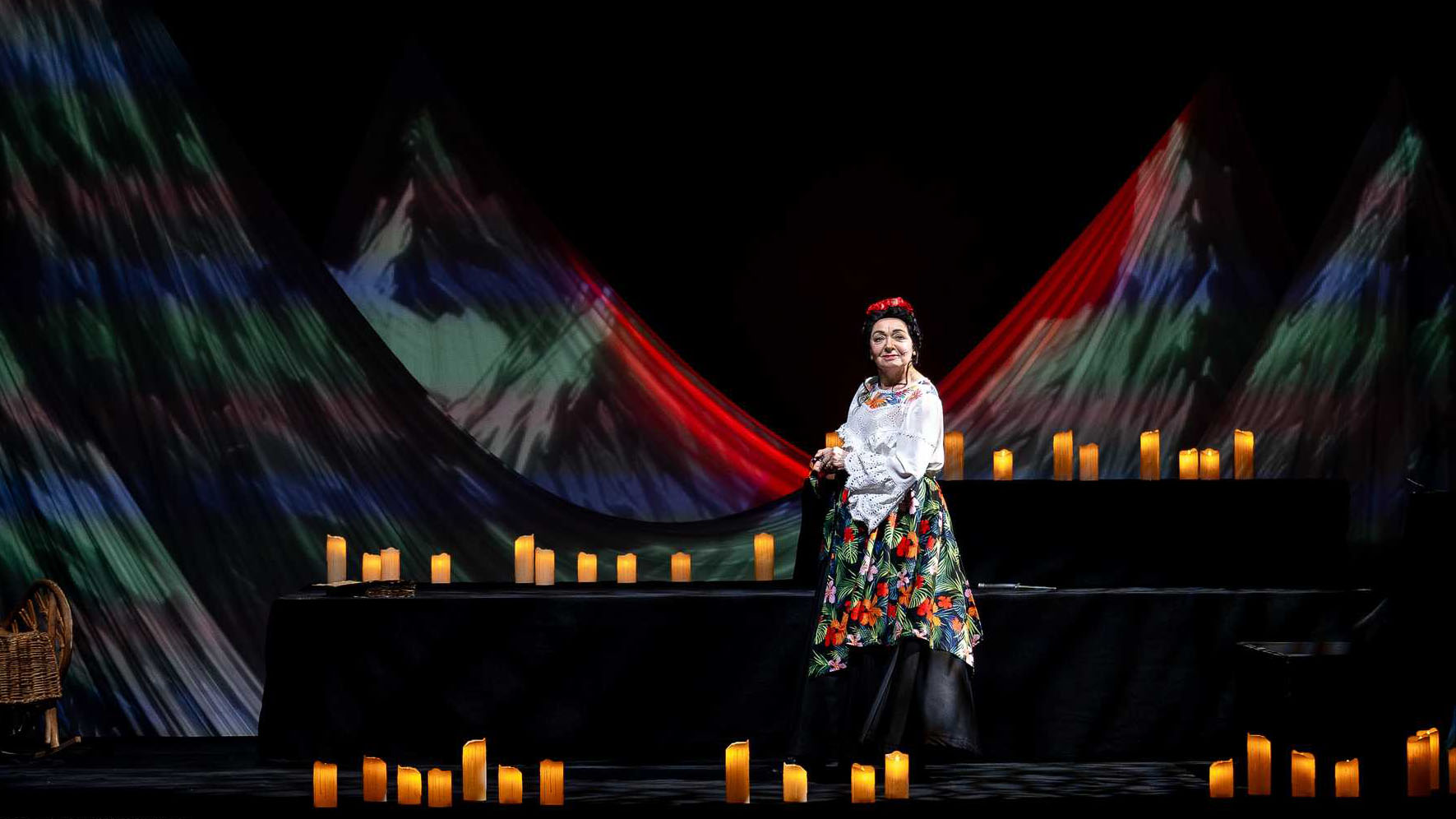 Спектакль очень атмосферный: остроумная сценография (художник-постановщик и художник по свету — Александр Прокопец) обыгрывает идею гор, которые меняют цвет по мере того, как меняются времена года, возраст героини и её настроение; многозначительно мерцает множество свечей, отсылающих и к католическим соборам, и к деревенскому быту начала ХХ века, звенит-стучит-свистит этническая перкуссия, талантливо смодулированная электроникой, управляемой Марком Либерзоном.
