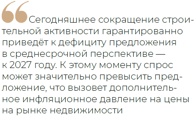 В перспективе текущее снижение строительной активности будет иметь определённые последствия. По мнению Кирилла Николаева, в ближайшие два года объём новых предложений значительно сократится — в продаже будет в основном то, что строят прямо сейчас.