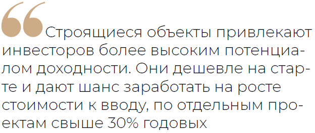 В свою очередь, строящиеся объекты привлекают инвесторов более высоким потенциалом доходности. Они дешевле на старте и дают шанс заработать на росте стоимости к вводу, по отдельным проектам свыше 30% годовых, отмечает Владимир Онянов. По словам Дмитрия Ончурова, такие объекты соответствуют новейшим стандартам и позволяют выбирать лучшие площадки и конфигурации, что повышает их привлекательность для арендаторов.