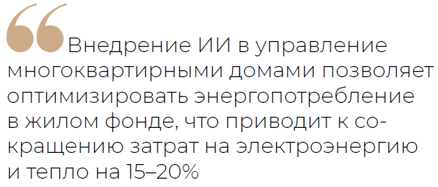 По данным исследования, проведённого онлайн-платформой Doma.ai, в 2024 году искусственный интеллект в своей работе использовали 13% управляющих компаний, что более чем втрое превышает показатель предыдущего года. По данным исследования «Цифровые технологии в механизме реализации жилищных прав граждан», внедрение ИИ в управление многоквартирными домами позволяет оптимизировать энергопотребление в жилом фонде, что приводит к сокращению затрат на электроэнергию и тепло на 15—20%.