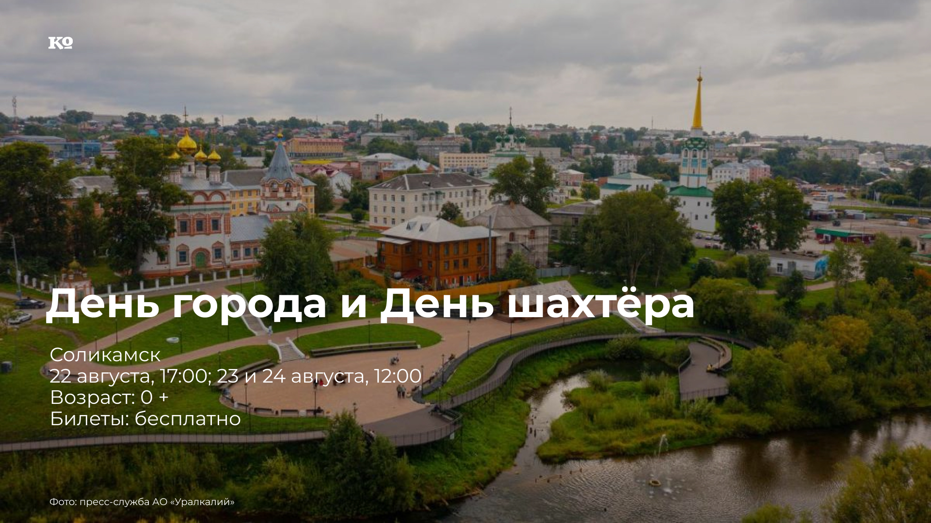 Соликамск отметит 595-летие. День города традиционно будет совмещён с Днём шахтёра. 22 августа в музее-заповеднике «Сользавод» пройдут театрализованные экскурсии, концерт симфонического оркестра из Перми и прогулки на теплоходе «Юнга Камы». 23 августа на главной сцене Воскресенской площади с 14:30 стартует концертная программа с участием пермских групп «Ананас» и «Корица» и артиста Театра-Театра Альберта Макарова. Хедлайнеры праздника — Мария Зайцева и участник дуэта «Чай вдвоём» Стас Костюшкин. В Центральном сквере в этот день с 12:00 до 18:00 будут работать интерактивные площадки: семейные развлечения, мастер-классы, фото и видеозоны. Завершится день дискотекой, выступлением диджея из Нижнего Новгорода и световым шоу. 24 августа можно будет прогуляться по историческому центру, посетить экскурсии на «Сользавод» и увидеть театрализованное представление «Огненное сердце» возле моста влюблённых.