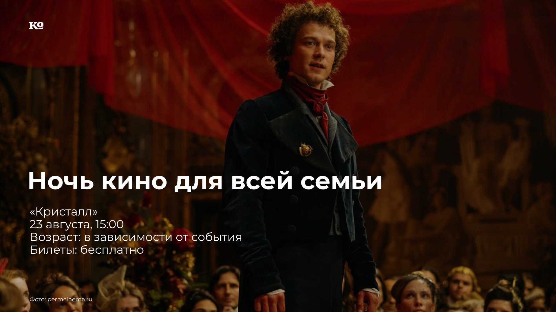 «Пермская синематека» тоже присоединяется к юбилейной, 10-й Всероссийской акции «Ночь кино». В 15:00 — фильм «Волшебник Изумрудного города. Дорога из жёлтого кирпича» (6+), новое прочтение знакомой сказки о маленькой девочке, мечтающей вернуться домой. В 17:30 — фильм «Пророк. История Александра Пушкина» (18+), музыкальная биография «солнца русской поэзии» с Юрой Борисовым в главной роли. В 20:30 — фильм «Группа крови» (18+), военная драма о страшных событиях 1943 года в детском донорском концлагере поселка Вырица Ленинградской области.