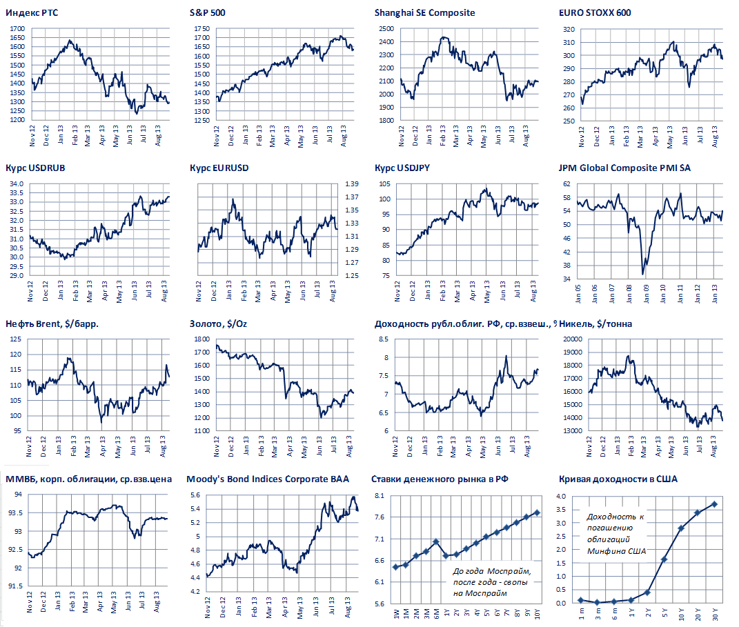 Сегодня в США — День Труда, биржи закрыты, сильных движений на мировых рынках не ожидается. Последний день лета мировые рынки завершили в небольшом минусе в преддверии новостей по Сирии. Индекс ММВБ откатился на 0,5% по итогам дня, за неделю потери составили 2,1%. Индекс S&P500 минус 0,32%, недельное снижение составило 1,8%. Рубль держится вблизи отметки 33,3 руб./$. Основная причина падения рынков и валют — геополитический фактор. Август, который традиционно ассоциируется с проблемами (2007 г. — начало кризиса subprime ипотеки, 2011 г. — снижение рейтинга США и т.д.) и в этом году не стал исключением.