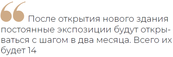 После открытия нового здания экспозиции будут открываться с шагом в два месяца. Всего их будет 14. Впервые будут представлены нумизматическая коллекция, коллекция изделий из драгоценных металлов, для демонстрации которых создаётся бронекладовая, и коллекция редкостей, среди которых — знаменитые египетские мумии.
