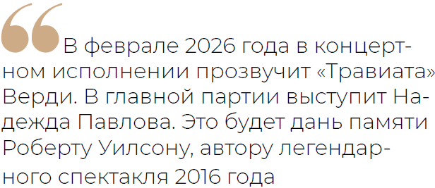 В феврале 2026 года в концертном исполнении прозвучит «Травиата» (6+) Верди. В главной партии выступит Надежда Павлова. Это будет дань памяти Роберту Уилсону, автору легендарного спектакля 2016 года.