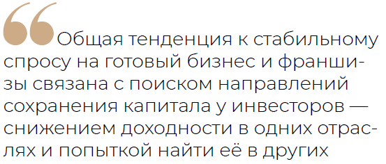 Общая тенденция к стабильному спросу на готовый бизнес и франшизы, по мнению Евгении Керзиной, связана с поиском направлений сохранения капитала у инвесторов — снижением доходности в одних отраслях и попыткой найти её в других, а также с успешным образом представителей бизнеса, у которых всё получается и поддерживается нарративом в рекламе и общественном мнении. Ещё одним фактором для потенциальных покупателей становится накопление опыта и желание перейти из найма в работу на себя.