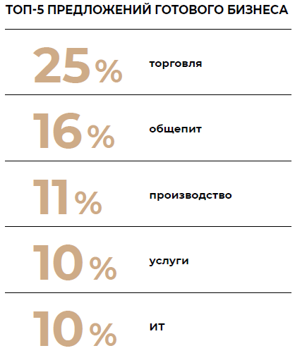 По объёму предложения готового бизнеса, представленного на платформе, в топ-5 сфер также вошли торговля, общепит и ИТ. Большую долю заняла торговля (25%), на втором месте оказался общепит (16%), затем производство (11%), услуги (10%) и ИТ (10%).