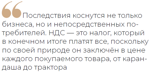 Последствия коснутся не только бизнеса, но и непосредственных потребителей. Татьяна Миролюбова подчеркнула, что НДС — это налог, который в конечном итоге платят все, поскольку по своей природе он заключён в цене каждого покупаемого товара, от карандаша до трактора. Кроме того, это разгонит инфляцию, поэтому Центробанк снижать учётную ставку не будет.