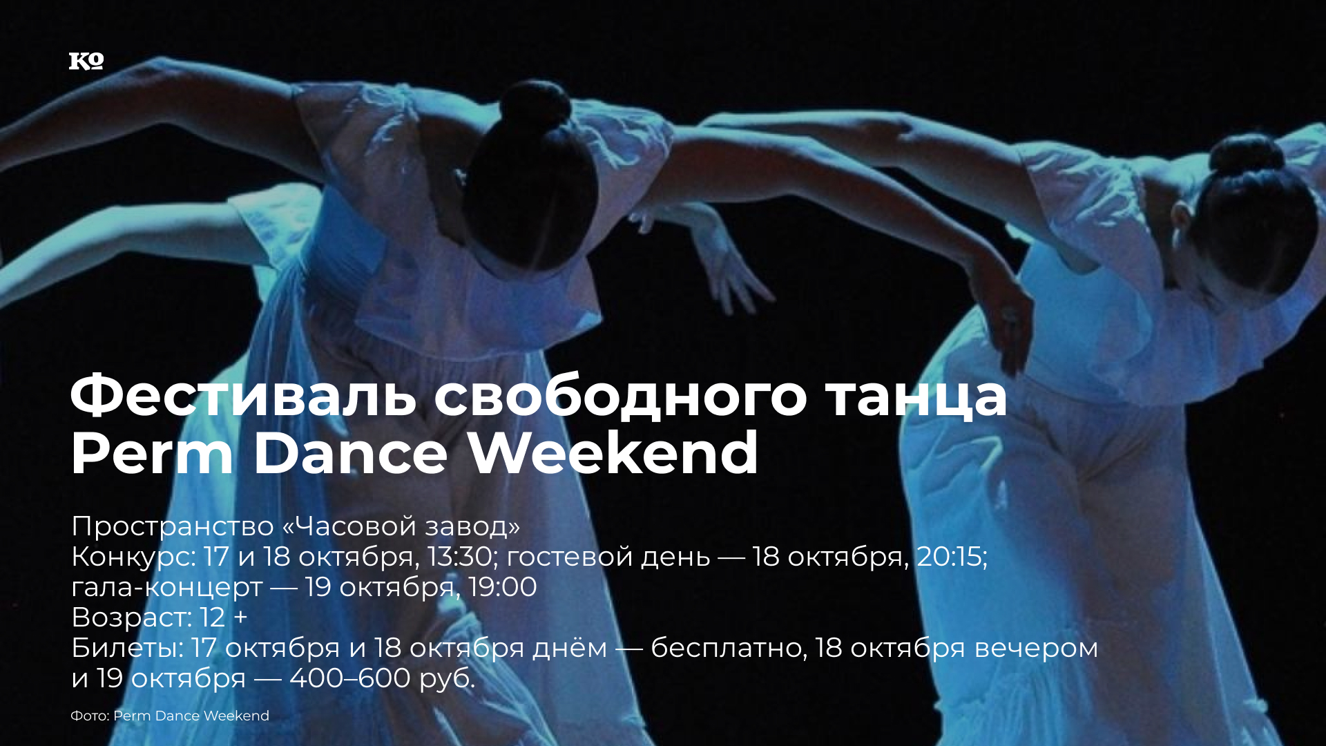 Два вечера пластических и хореографических спектаклей и перформансов танцевальных коллективов со всей России. В гостевой программе фестиваля 18 октября — два спектакля Андрея Просвирнина: «Главное блюдо» DNA DANCE COMPANY (Киров) и «Исход» Свободного театра современного танца (Пермь). В рамках фестиваля проходит конкурс, в котором участвуют детские и самодеятельные коллективы Перми, Кирова и Челябинска. Полностью конкурсные показы можно посмотреть 17 и 18 октября бесплатно. Лучшие работы будут показаны на вечере современной хореографии 19 октября.
