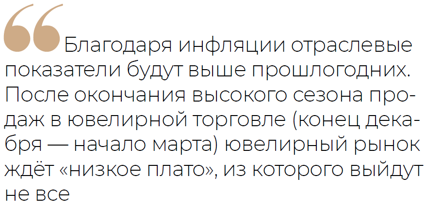 «Благодаря инфляции отраслевые показатели будут выше прошлогодних. После окончания высокого сезона продаж в ювелирной торговле (конец декабря — начало марта) ювелирный рынок ждёт «низкое плато», из которого выйдут не все», — уверен эксперт.