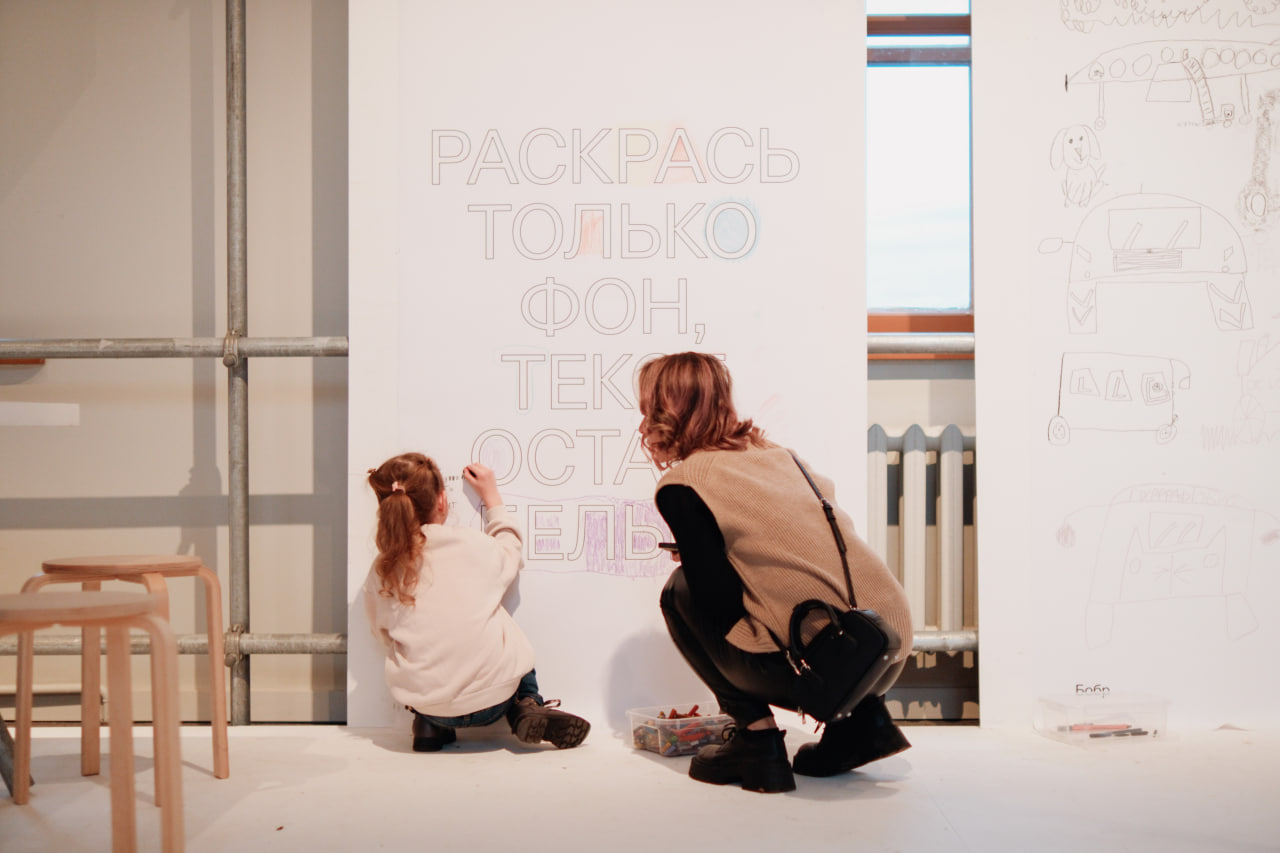Выставка состоит из двух частей. Первая часть — теоретическая, где мы исследуем раскраску и творчество художников, которые в этой сфере работали. Вторая часть — «раскраски про раскраску»: мы подключили детей в Перми и Казани, обсуждали с ними, что такое раскраска, а потом дети рисовали разные изображения, которые мы в процессе выставки будем раскрашивать.