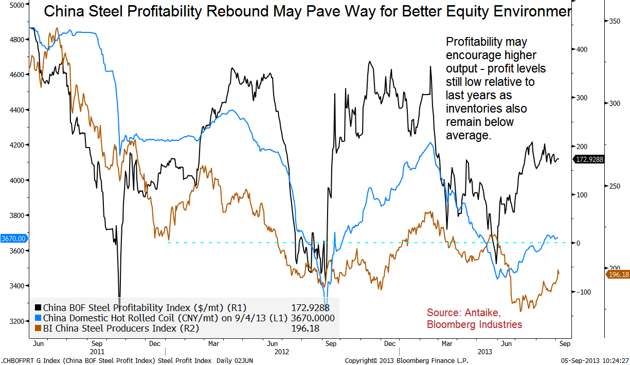 «Блумберг» сегодня пишет об улучшении состояния металлургов в Китае. Предложение, отстающее от спроса, приводит к сокращению запасов и поднимает цены — сейчас цены на арматуру, занимающую примерно треть всего металлургического рынка Китая, находятся на максимумах за последний год — плюс 7% в 4 квартале. Отмечается рост прибыли производителей (чёрная линия на графике ниже). Тем же путём идут и цены на железную руду (+24% с конца мая, до $138 за т.).