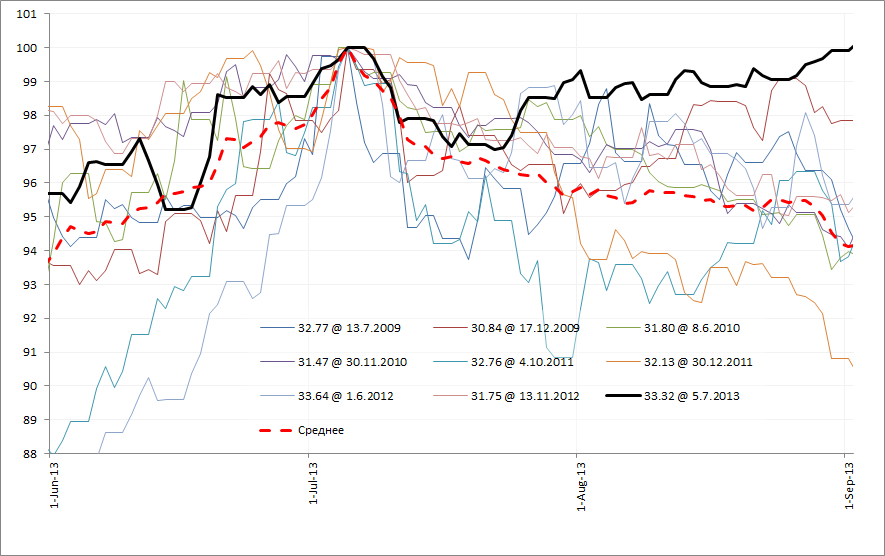 Сегодняшняя статья в «Ведомостях» о снижении цен на коксующийся уголь в России, который следуют общей тенденции сжатия рынка стали, может быть сигналом окончания тенденции.Фондовые рынки (и цены товарных фьючерсов тут не исключение) имеют исторический артефакт, свидетельствующий, что массовое упоминание в прессе часто является признаком окончания тенденции. Хотя как и любой артефакт (или стилизованный факт), он имеет риск не повториться — пример, наш прогноз рубля, который вопреки ожиданиям не укрепляется, а падает дальше (сейчас уже 33,32, доходил до 33,5). На графике ниже чёрной линией указана траектория, по которой курс рубля движется сейчас (в этом году). Видно, что наш расчёт на близость к среднему оказался наивным и мы попали в крайний случай, хвост распределения.