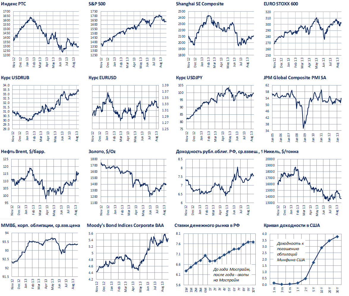 Из важных событий следует отметить 2-дневный саммит, стартующий сегодня в Санкт-Петербурге. В преддверии саммита В. Путин и А. Кудрин дали развернутые интервью об их взгляде на развитие российской экономики. В.Путин пообещал, что секвестра бюджета не будет, но расходы придется сократить, идти по пути европейских стран и наращивать госдолг не планируется. А. Кудрин считает, что снижение ставок ЦБ преждевременно в условиях оттока капитала. Для сохранения капитала в стране необходимо повышать процентные ставки. Таким образом, неопределенность вокруг изменения процентных ставок сохраняется, вероятно, ЦБ оставит их неизменными, пока внешний фон не стабилизируется. На решение ЦБ оказывает давление ситуация вокруг Сирии и начало сворачивание программы количественного сворачивания, следствием которой является уже начавшийся отток капитала из страны.