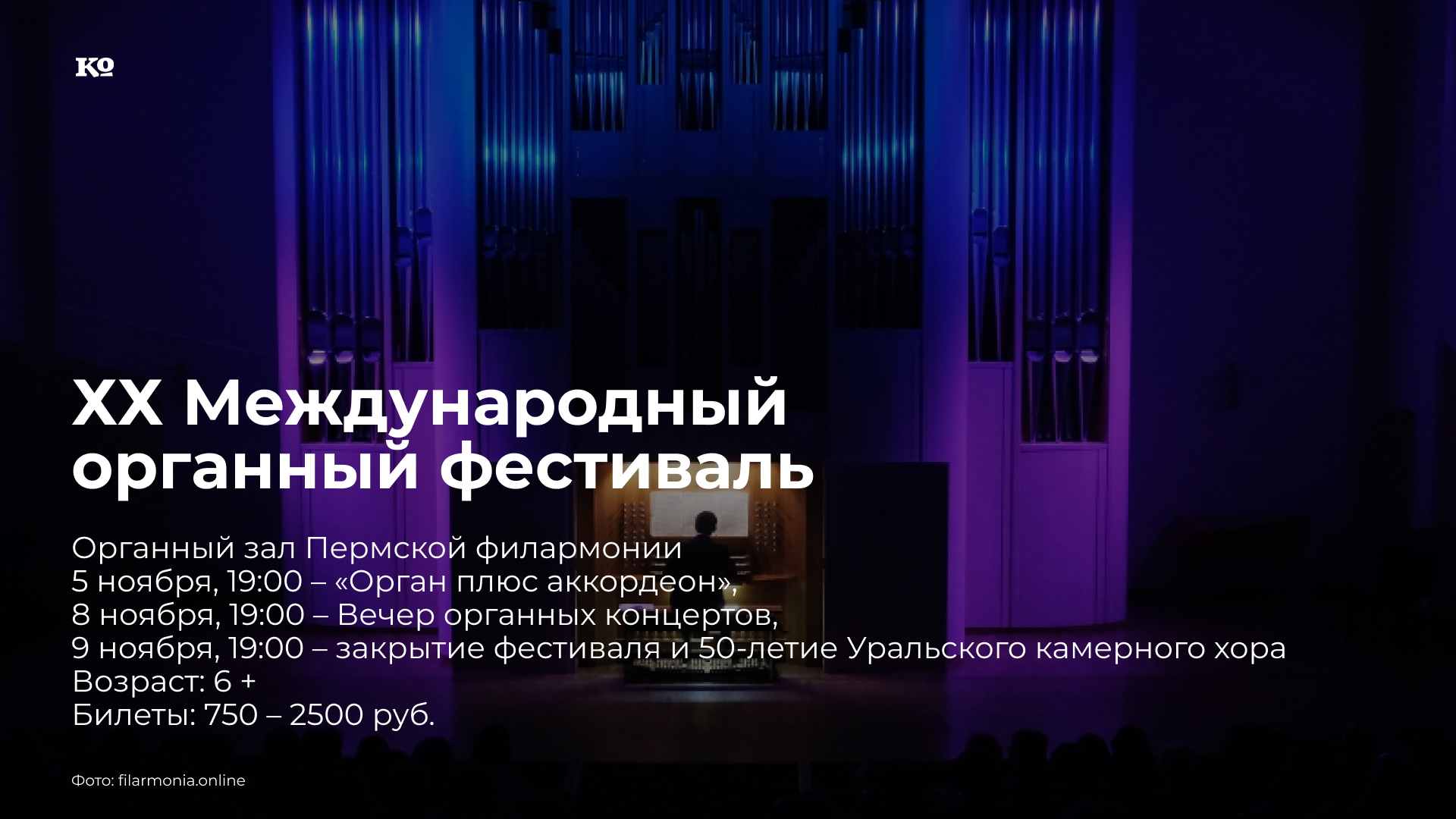 Завершается юбилейный органный фестиваль Пермской краевой филармонии. 5 ноября лауреаты всероссийских и международных конкурсов Александр Хмарный (орган) и Юлия Попкова (аккордеон) исполнят музыку Иоганна Себастьяна Баха, его двоюродного брата Иоганна Готфрида Вальтера, Вольфганга Амадея Моцарта, Микаэла Таривердиева и Астора Пьяццоллы. 8 ноября прозвучат концерты для органа с оркестром Георга Фридриха Генделя, Иоганна Кристиана Баха, Антонио Вивальди, а также композиторов ХХ и XXI веков в исполнении камерного оркестра «Солисты Нижнего Новгорода» и лауреата международных конкурсов Каллиники Медведевой (Беларусь). В вечер закрытия фестиваля Уральский камерный хор Пермской филармонии выступит с юбилейной программой в честь своего 50-летия. В концерте примут участие оркестр «Солисты Нижнего Новгорода», солистка Нижнетагильской филармонии Наталья Воронина (орган), Пермская хоровая капелла мальчиков и пермские музыканты: композитор и дирижёр Дмитрий Батин, органистка Евгения Камянская, солистка Пермской оперы Наталья Буклага и аккордеонист Александр Прокопчук. Прозвучат духовные и светские произведения Бортнянского, Чайковского, Сен-Санса, Вьерна, Рахманинова, Раттера, Свиридова, Гаврилина, Палмери, а также русские народные песни.