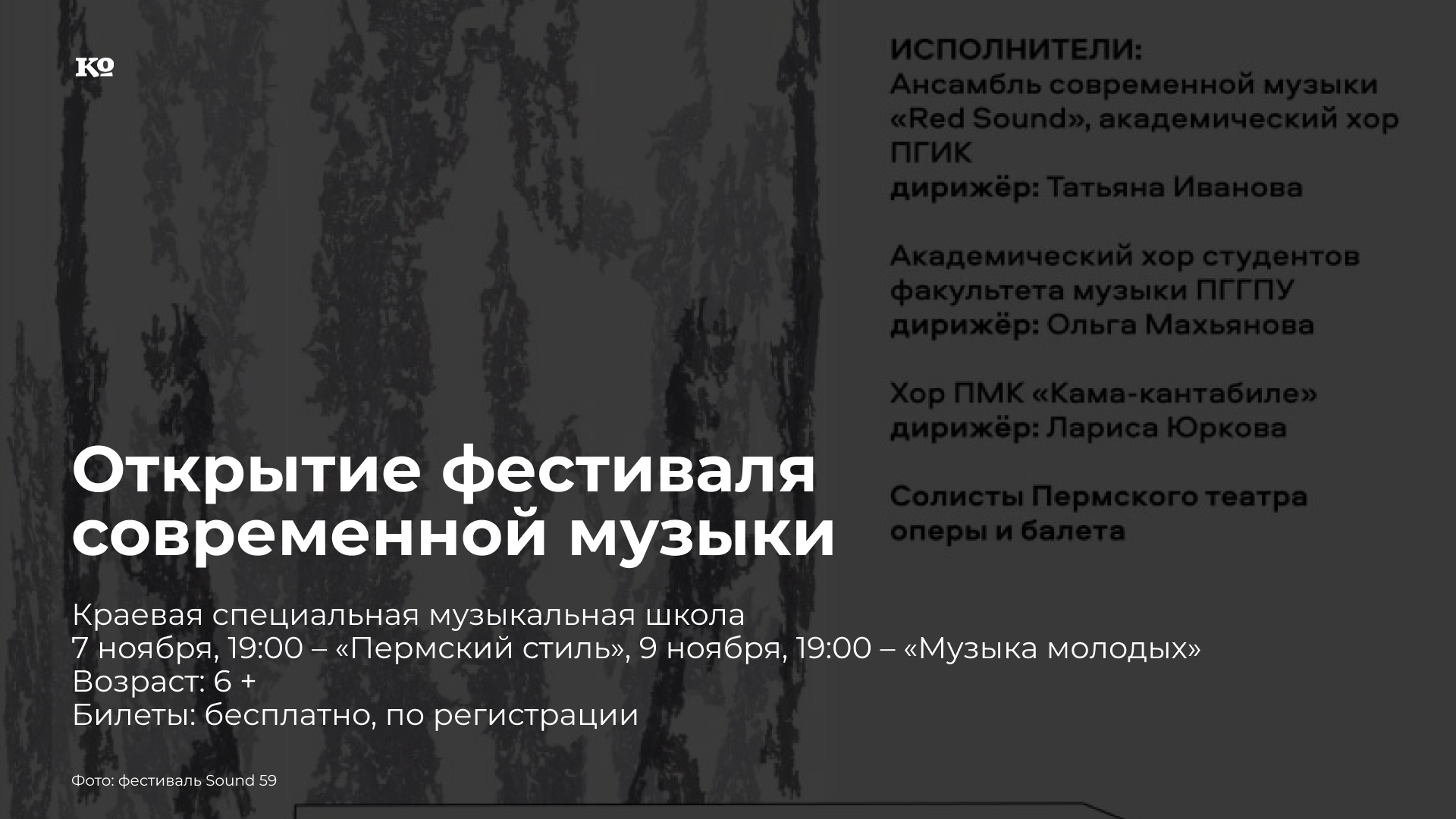 В Перми в восемнадцатый раз пройдет Международный фестиваль современной музыки Sound 59. Как всегда, в программе не только концерты, но и образовательные и теоретические события: круглые столы, мастер-классы, творческие встречи. Открытие фестиваля состоится 7 ноября в Краевой музыкальной школе. В программе «Пермский стиль-2025» (6+) — новые сочинения Дмитрия Батина, Алексея Вершинина, Оксаны Изотовой, Евгении Кудряшовой, Игоря Машукова, Геннадия Широглазова, Никиты Широкова, Анастасии Выймовой, в том числе впервые прозвучат три номера из мюзикла Игоря Машукова «Волга-Волга-Кама»: «Прибытие «Севрюги», «Вальс» и «Финал» — в исполнении солистов Пермского театра оперы и балета Ольги Поповой и Виктора Погудина, ансамбля современной музыки Red Sound и Академического хора ПГИКа. В программе концерта «Музыка молодых» — произведения учащихся специальных учебных заведений Перми и Чайковского. События фестиваля продолжатся на следующей неделе.