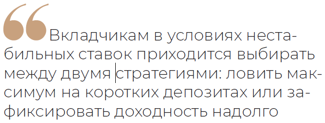 В пользу этой стратегии вкладчиков склоняют и акционные «приветственные» ставки. Гаянэ Замалеева отмечает: разница между стартовой и базовой ставками достигает 2—3 п. п., но действует только один-два месяца. В итоге короткие депозиты выгодны для активных вкладчиков, готовых мониторить рынок.