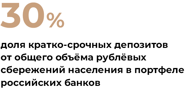 В портфеле российских банков доля краткосрочных депозитов (сроком до 180 дней) достигла рекордных 30% от общего объёма рублёвых сбережений населения — около 16 трлн руб., что на 60% больше, чем годом ранее. Вкладчики массово выбирают такие продукты, стремясь зафиксировать доходность 15—17% годовых на фоне цикла снижения ключевой ставки ЦБ (16,5%), опасаясь её дальнейшего падения. В результате формируется парадокс: банки вынуждены ориентироваться на «спринтерский» горизонт, жертвуя стабильностью фондирования ради удержания капитала.