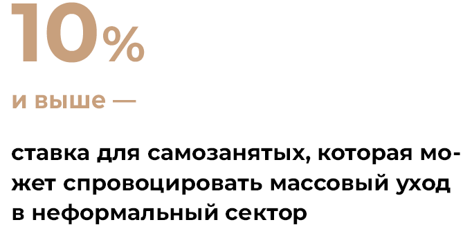 По мнению Елены Лавренчук, повышение ставки для физлиц выше 6% бессмысленно — самозанятый просто станет ИП с региональной ставкой от 1 до 6%. Ума Аюбова расширяет диапазон до 6—8%, но подчёркивает: при ставке 10% и выше риск теневого сектора становится критическим.