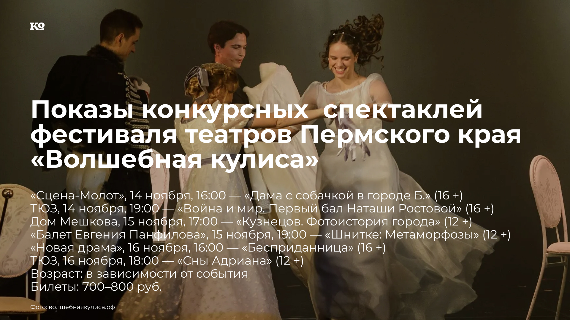 Продолжается фестиваль-конкурс премьерных спектаклей театров Пермского края «Волшебная кулиса», дающий жителям краевого центра возможность увидеть лучшее из всего, что было сделано в театрах территорий региона за два сезона. В пятницу Березниковский драматический театр покажет «Даму с собачкой в городе Б.» — сиквел знаменитой чеховской новеллы в постановке Петра Незлученко, а Пермский ТЮЗ сыграет для фестивальной публики свою версию «Войны и мира». В субботу на «Волшебной кулисе» впервые выступит театр-лаборатория «Открытый код»: в Доме Мешкова он сыграет документальный спектакль «Кузнецов. Фотоистория города». Вечером в конкурсе «Кулисы» — «Шнитке: Метаморфозы» театра «Балет Евгения Панфилова». В воскресенье продолжатся показы современных театральных версий классической русской литературы: камерный театр «Новая драма» покажет «Бесприданницу», а Чайковский театр драмы и комедии — «Сны Адриана» по повести Пушкина «Гробовщик».