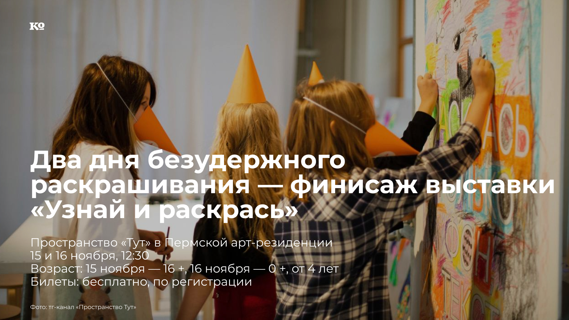Два дня, посвящённые закрытию выставки про феномен книги-раскраски. 15 ноября пройдут мероприятия для взрослых, а 16 ноября — для семей с детьми и подростков. 15 ноября, 12:30 — Встреча-экскурсия по выставке «Узнай и раскрась» с Еленой Когут — искусствоведом и хранителем печатной графики Пермской художественной галереи (16+): знакомство с графикой известных художников XX века, с многообразием техник печатной графики, а также с работой хранителя и реставратора. В 14:00 — кураторская экскурсия и воркшоп по выставке «Узнай и раскрась» с Любовью Шмыковой, (16+): разговор об основных идеях и смыслах проекта, а затем — погружение в медитативную практику раскрашивания, оформление огромных раскрасок на листах поликарбоната с помощью цветного скотча, пластилина и акрила. 16 ноября, воскресенье — безудержное раскрашивание: раскрашиваем стены, пол и столы! С собой необходимо взять одежду, которую не жалко испачкать, сменные носки, удобную и моющуюся сменную обувь.