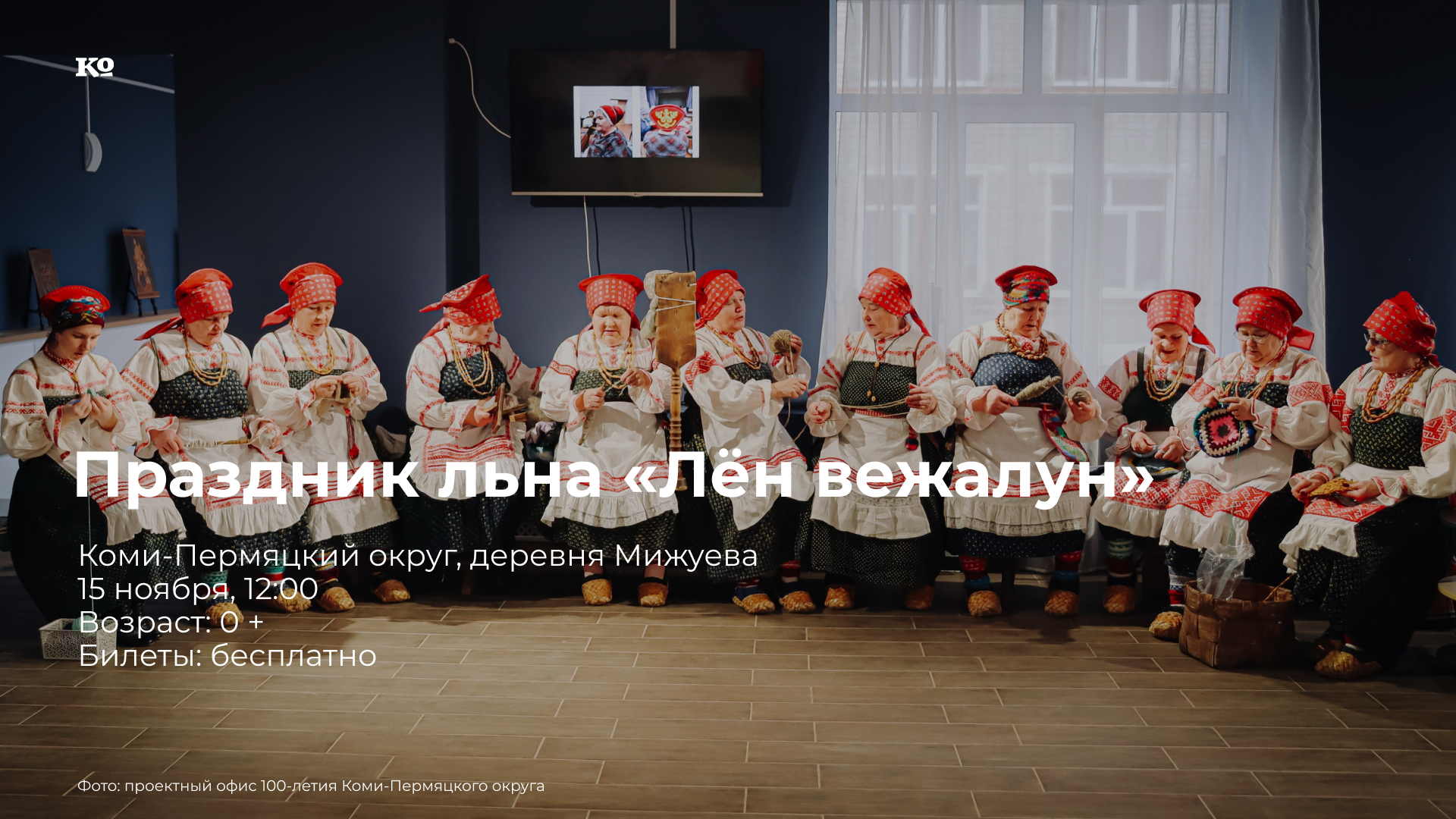 «Лён вежалун» — фестиваль, посвященный старинным коми-пермяцким традициям выращивания и обработки льна. Гостей ждёт мастер-шоу «От льна-долгунца до полотна», где покажут полный цикл обработки льна от стебля до готовой ткани. Пермский маслодел Алекс Потапов проведёт мастер-класс по изготовлению льняного масла холодного отжима, а на дегустационной площадке можно будет попробовать национальный напиток коми-пермяков — сур. Кроме того, в программе интеллектуальная площадка «Льняной турнир», театрализованная сказка «Как Матрёна-силачка разбойника одолела», концерт коллективов «Калинка» и «Калинушка», показ коллекций «ЭтноМода», мастер-классы и игровые зоны для всей семьи. Организован трансфер до места проведения мероприятия. Выезд от Коми-Пермяцкого этнокультурного центра 15 ноября в 11:00. Бронирование мест в автобусе по номеру: 8 (34 260) 4-76-19 (Ольга Ивановна).