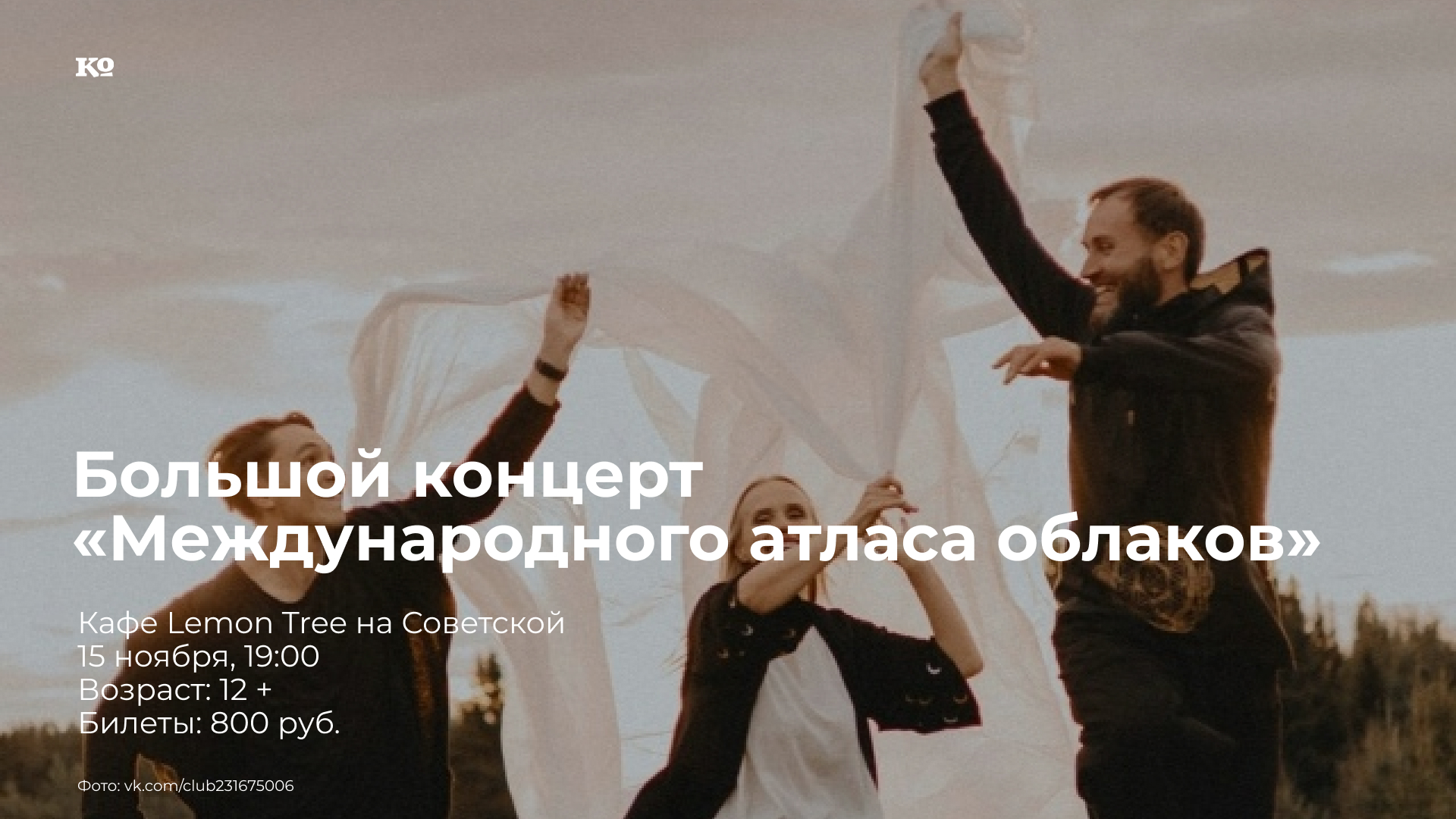 Первый большой концерт «Международного атласа облаков». Этно, электроника, транс, медитатив и нью-эйдж — на стыке стихий и состояний. В арсенале коллектива — более десятка редких инструментов: саз, диджериду, варган, флейты, калюка, сантур, различные язычковые барабаны — ханг, RAV Drum, ArtQuint, Orion, небесная сфера, Wood Tone, а также электрогитара, мелодика, синтезатор и др. Участники: Алексей Евченко (гитары, саз, балалайка, мелодика, управление плейбеками), Тихон Громоглас (диджериду, варганы, этно-флейты, ханг/рав, сантур и др.), Любовь Ощепкова (клавиши, перкуссия).