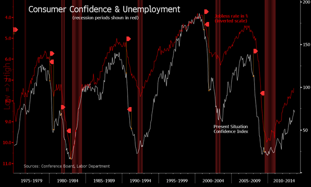 Сегодня Блумберг публикует график дня, сравнивающий динамику индикатора потребительской уверенности и уровня безработицы на американском рынке. В комментариях к графику отмечается, что индекс уверенности может служить неплохим опережающим индикатором состояния на рынке труда. Шкала для уровня безработицы построена слева и инвертирована. Видно, что динамика безработицы достаточно точно повторяет изменение индекса потребительской уверенности. Объясняется это тем, что персонал имеет представления о состоянии дел в компании и закладывает их в свои ожидания, что транслируется в индекс потребительской уверенности. Официальная статистика публикуется гораздо позже. Судя по графику, уверенность потребителей растет, рынок труда в США восстанавливается. В конце следующего года или в 2015 г. ФРС начнет поднимать ставки по мере достижения уровня безработицы в 6,5%.
