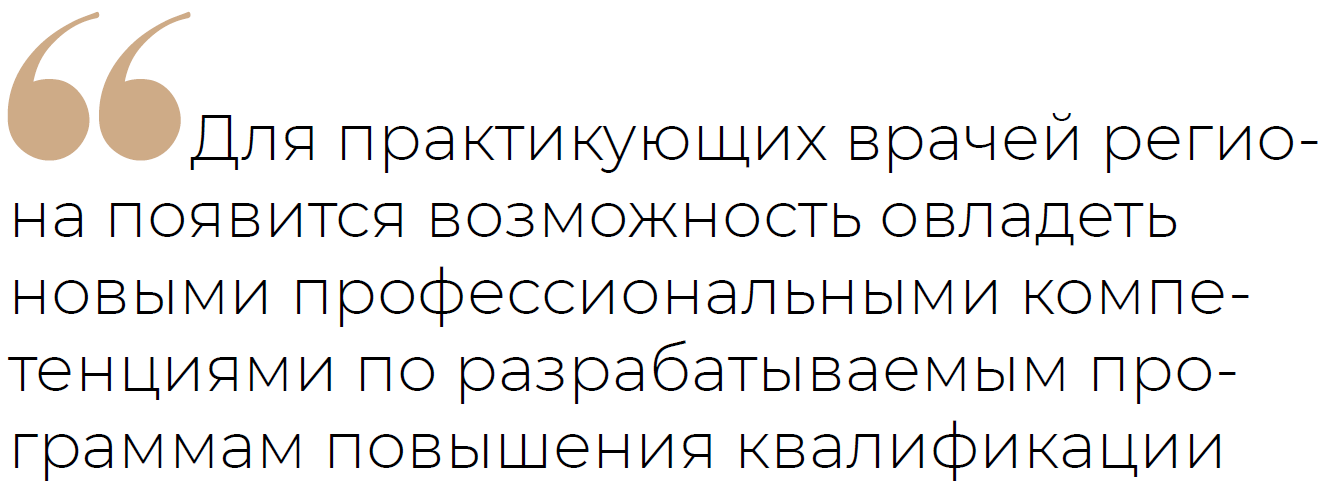 Для практикующих врачей региона появится возможность овладеть новыми профессиональными компетенциями по разрабатываемым программам повышения квалификации, входящими в продуктовую программу. Сотрудничество с Министерством здравоохранения Пермского края и крупными медицинскими компаниями в сфере здравоохранения, например «МедИнвестГрупп», позволяет сформировать перечень актуальных направлений, требующих своевременных и современных подходов в вопросах лечения пациентов.