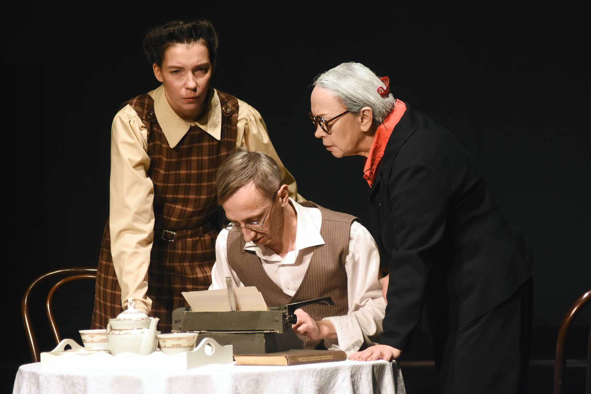 Юлия Трапикас, Василий Цаплин и Елена Шарантай в спектакле «Живое вещество академика Лепешинской»