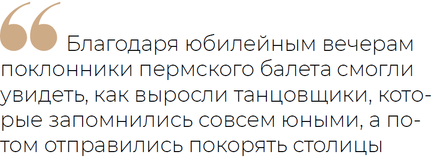 Редкое событие становится поводом для такого количества публичных мероприятий: в честь юбилея Пермского хореографического училища были созданы две концертные программы, и каждая исполнялась на сцене Театра оперы и балета два раза. Особым торжеством стало открытие обновлённого учебного театра, который после ремонта превратился в театр-музей, — об этом «Новый компаньон» уже подробно писал.