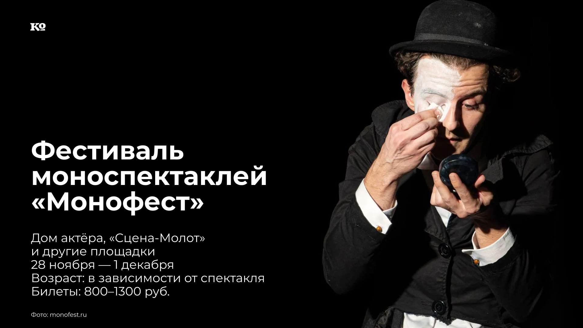 XII фестиваль-конкурс моноспектаклей «МОНОфест» собрал 11 спектаклей в одном из сложнейших и интереснейших театральных жанров. «Dyimovochka trip» (18+) театра «Блоха», Санкт-Петербург — погружение в микромир крошечной героини Андерсена (28 ноября, 19:00 и 21:00; 1 декабря, 12:00 и 20:00, цветочный магазин «Les Fleurs Du Mal»,ул. Пермская, 43). «Моя война» (12 +) — театральная фантазия о жизни Чарли Чаплина (28 ноября, 19:00, Дом актёра). «15 172» (18 +) — хореографическое откровение о ВИЧ (28 ноября, 21:00, театр «Балет Евгения Панфилова»). «Порфирий» (16 +) — медитативный детективный мэшап романа Достоевского и новелл Акутагавы (29 ноября, 16:00, Дом актёра). «Скромный американец» (16 +) — рефлексии юноши под 50 (29 ноября, 18:00, «Сцена-Молот»), «Владимир Маяковский: Послушайте!» (12 +) — разговор под гитару и с танцами о природе творчества (29 ноября, 21:00, театр «Балет Евгения Панфилова»). «Ольга Запретный дневник» (18 +) — кривая судьбы музы Ленинграда по стихам, прозе и материалам следственного дела Ольги Берггольц (30 ноября, 18:00, Пермский ТЮЗ). «Русская смерть. Воспоминания о спектакле» Дмитрия Волкострелова (18 +) — ностальгические рефлексии режиссера по ушедшей в никуда постановке (30 ноября, 21:00, «Сцена-Молот»).