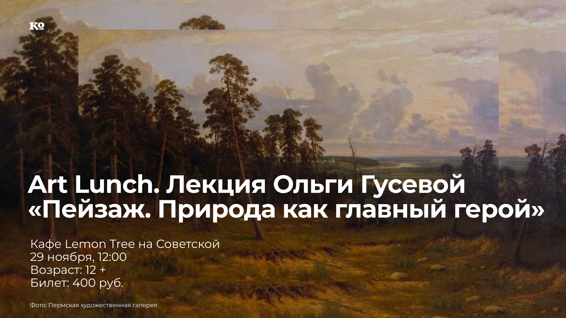 В центре внимания лектора окажутся произведения, где главный герой — природа. Несмотря на свою популярность сегодня, долгое время пейзаж относили к «низшим» жанрам живописи, а первый ландшафтный класс в России появился только спустя 20 лет после основания Императорской академии художеств, в 1776 году. Однако уже в 1871 году знаменитый пейзаж Алексея Саврасова «Грачи прилетели» стал одной из самых популярных работ на первой выставке передвижников и сразу же был куплен Павлом Третьяковым. Ведущий научный сотрудник Пермской галереи, культуролог Ольга Гусева попробует проследить путь пейзажной живописи от редких «вкраплений» в высокие жанры до важнейшей части мирового искусства.