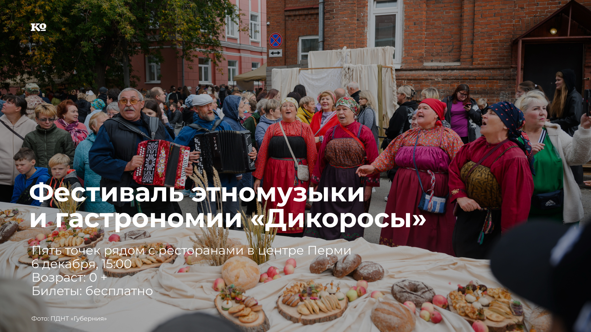Музыкальные события пройдут на площадках ресторанов, шефы которых участвуют в гастрономическом эксперименте: создании фьюжн-меню, в которых коми-пермяцкие традиции сочетаются с современными веяниями, с собственными авторскими разработками шефов, а также с традициями кухонь других народов. Так появляются щи-рамен, кебаб по-коми-пермяцки и другие кулинарные диковинки. Фестиваль пройдёт с 15:00 до 18:00 в пяти локациях: двор по ул. Куйбышева, 33 («ПокеРамен» и «Парадная»); двор за ЦУМом (KebabKlub, площадка внутри заведения); двор по ул. Пермской, 80 (Usagi); «Дом Третьяковой» (ул. Советская, 32); «Игрушки» (ул. Революции, 20). В программе — концерты народных коллективов, традиционные забавы, гастрономические презентации и дегустации специальных блюд в формате бранча. Участвуют фольклорные ансамбли «Кукушка» из одноименной деревни, «Карповчанка» из села Архангельское, «Визыв шор» из Юксеево, «Верхокамье» из Сепыча, а также Глафира Утёмова и Даша Калина. Песни, игры, частушки, мастер-классы, хороводы, плясовые. Специальные сеты, объединяющие народную и электронную сцену, сделали диджеи CASTO, TE KIN, KIKOK, KLASSEN, MATTHEW RACCOON, музыкальный диггер Верещагина.