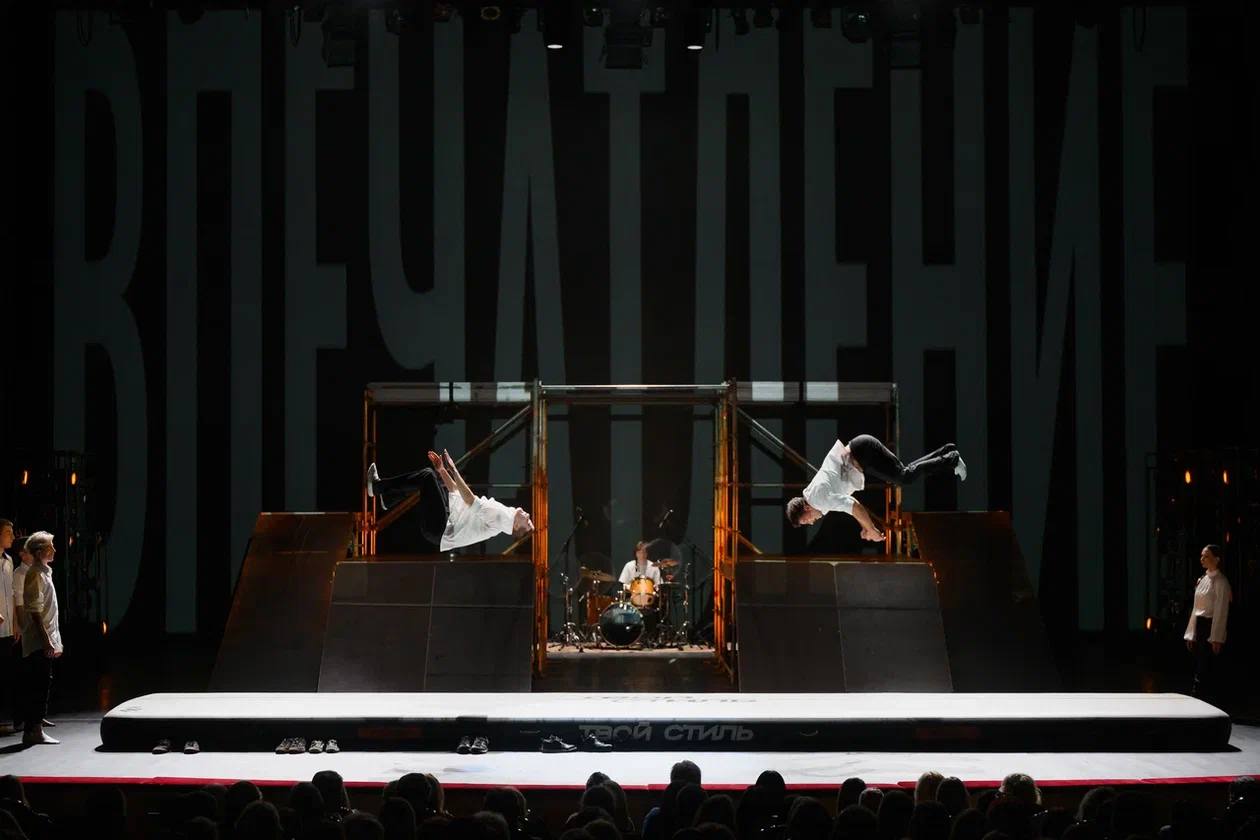 Танцевальная партитура была несколько менее дерзкой и рискованной, чем во время показа на эспланаде — всё-таки статусная сцена не только даёт новые возможности, но и налагает ограничения; паркурщики двигались, как и положено пракурщикам, без всякой страховки, и самые опасные элементы из их арсенала на эту сцену не попали. Так, практически не было сальто назад от рампы, не было преодоления препятствий на высоте, почти не было прыжков «через улицу» — все сальто исполнялись на мате, а рампы и перекладины использовались как детские горки и турники.