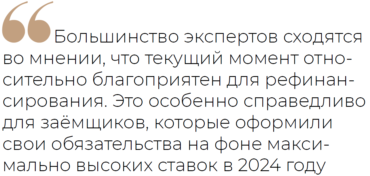 Большинство экспертов сходятся во мнении, что текущий момент относительно благоприятен для рефинансирования. Это особенно справедливо для заёмщиков, которые оформили свои обязательства на фоне максимально высоких ставок в 2024 году.