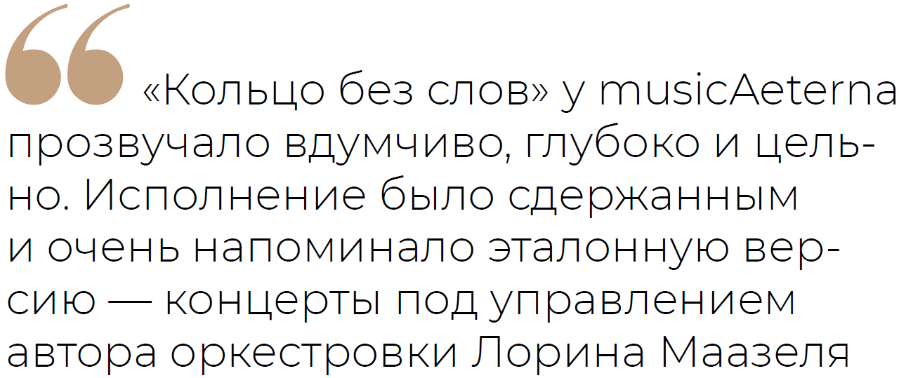 «Кольцо без слов» у musicAeterna прозвучало вдумчиво, глубоко и цельно. Коллектив Курентзиса известен своими преувеличенными, гиперэмоциональными трактовками классики, но не в этот раз. Исполнение было сдержанным и очень напоминало эталонную версию — концерты под управлением автора оркестровки Лорина Маазеля.